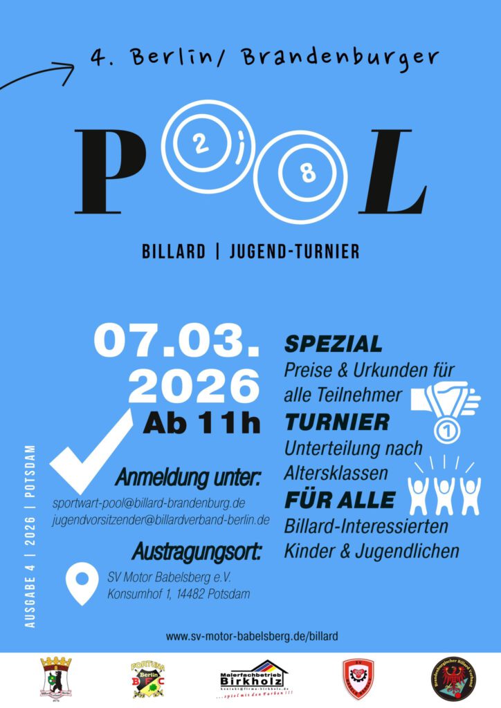Das 4. Turnier findet nun wieder in Potsdam-Babelsberg am Sonnabend, den 07. März 2026 statt. Da wechseln wir (Berlin/Brandenburg) uns ab. Einzelheiten / Anmeldung siehe Plakat unter diesem Text.