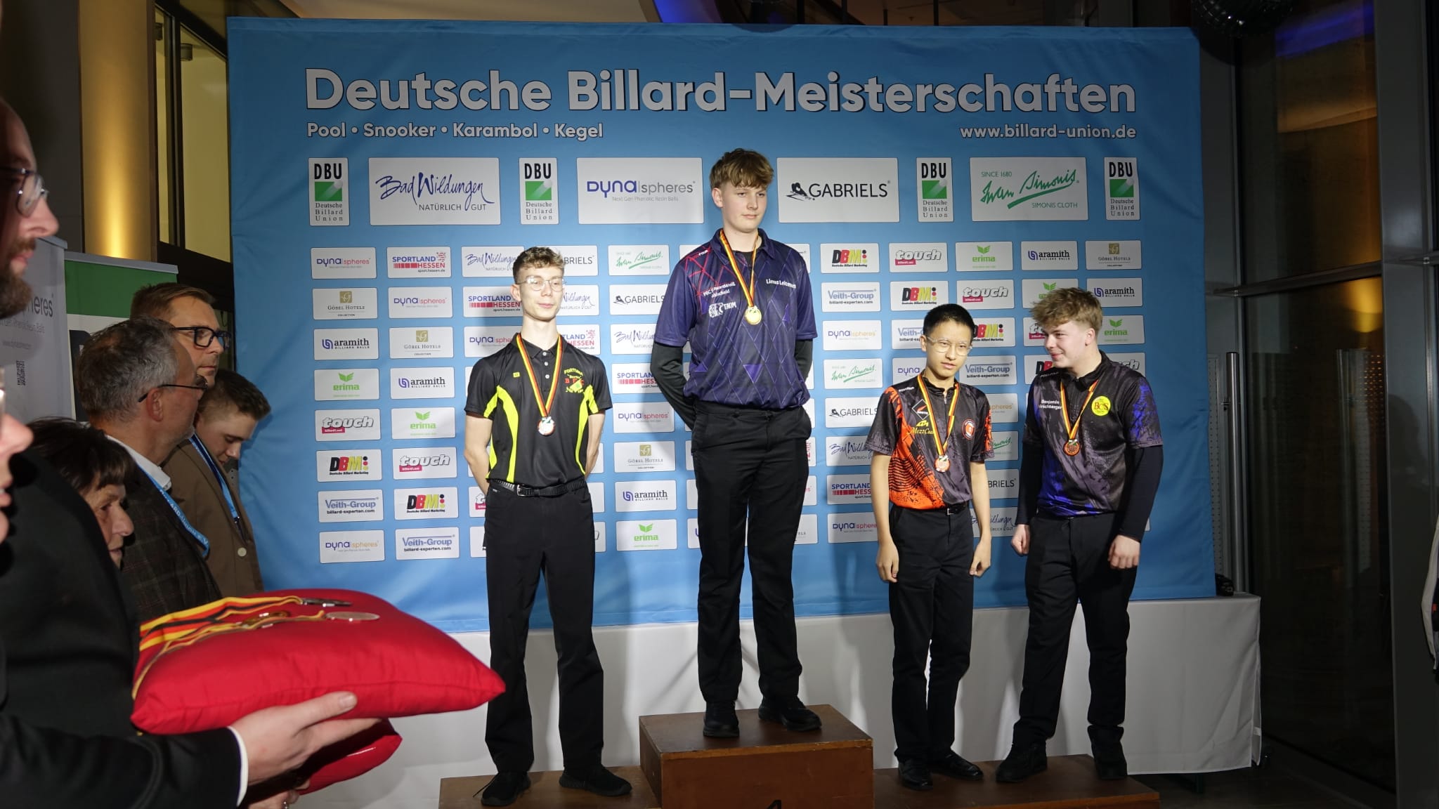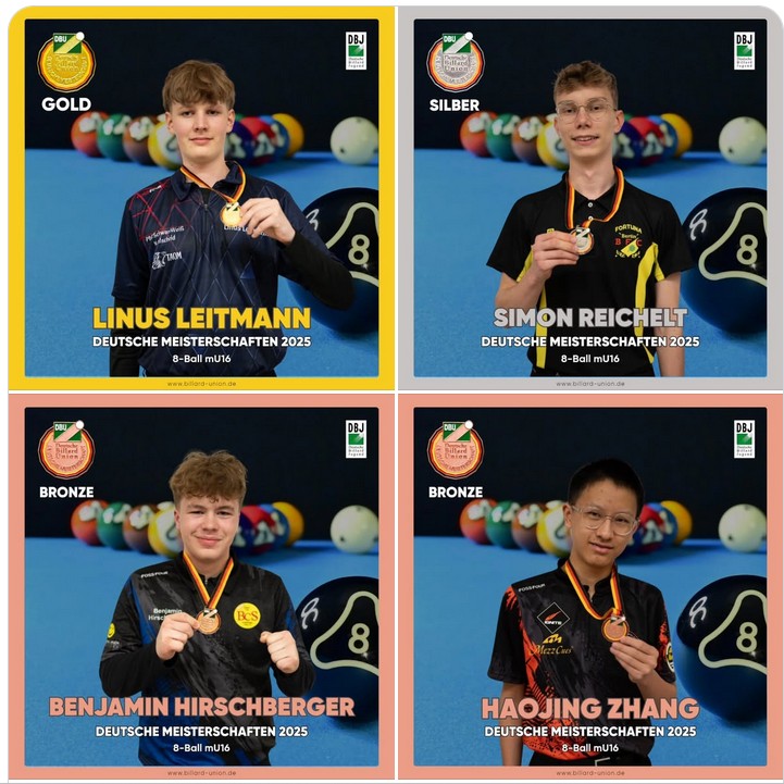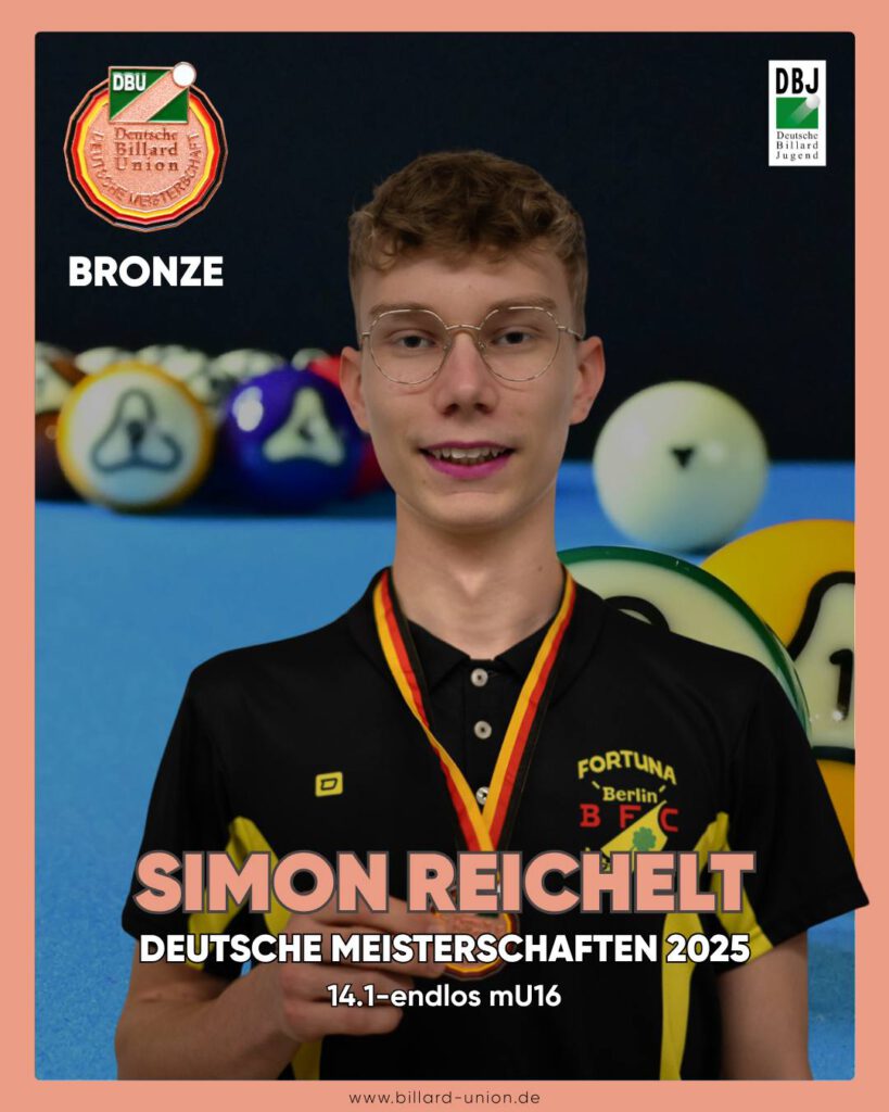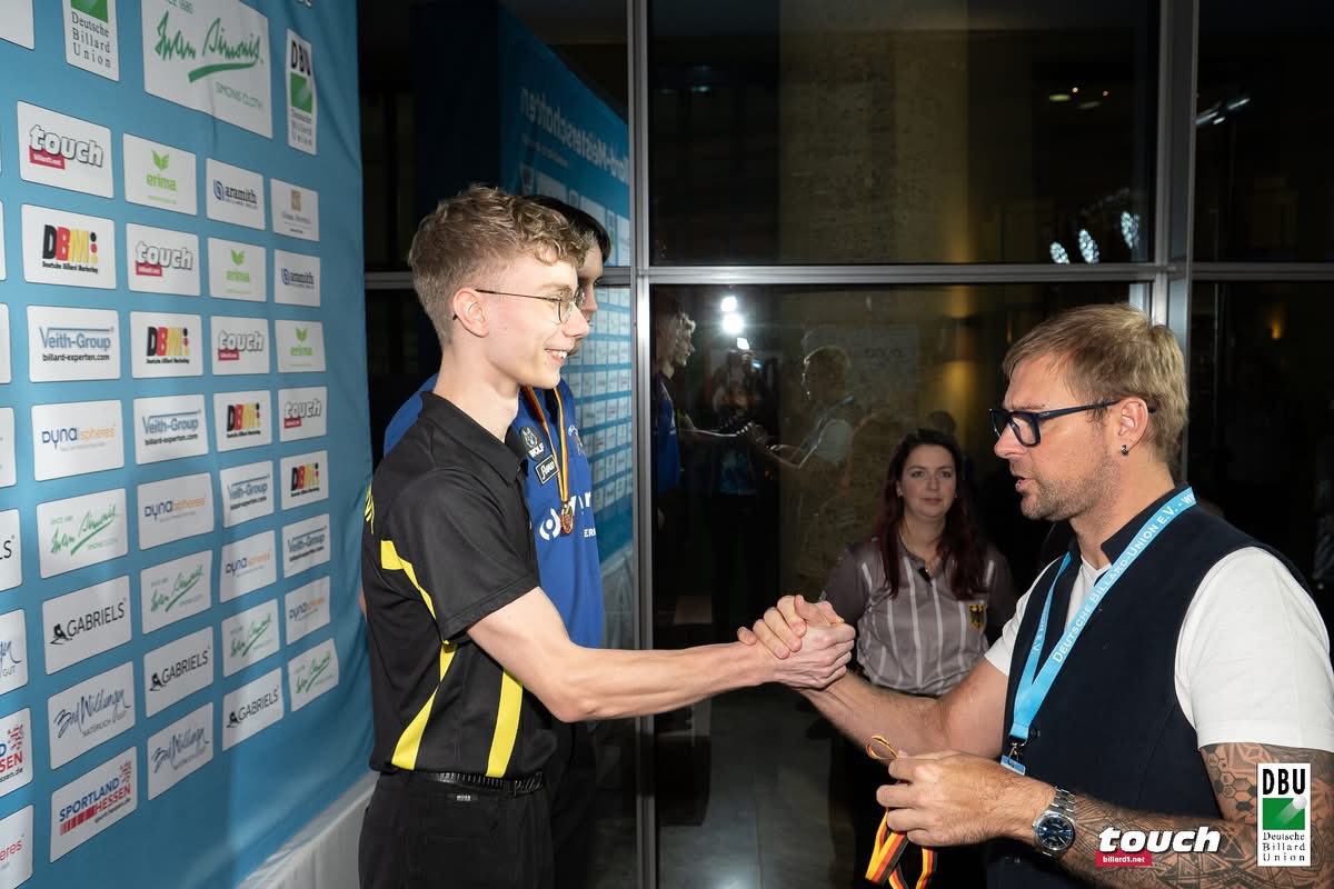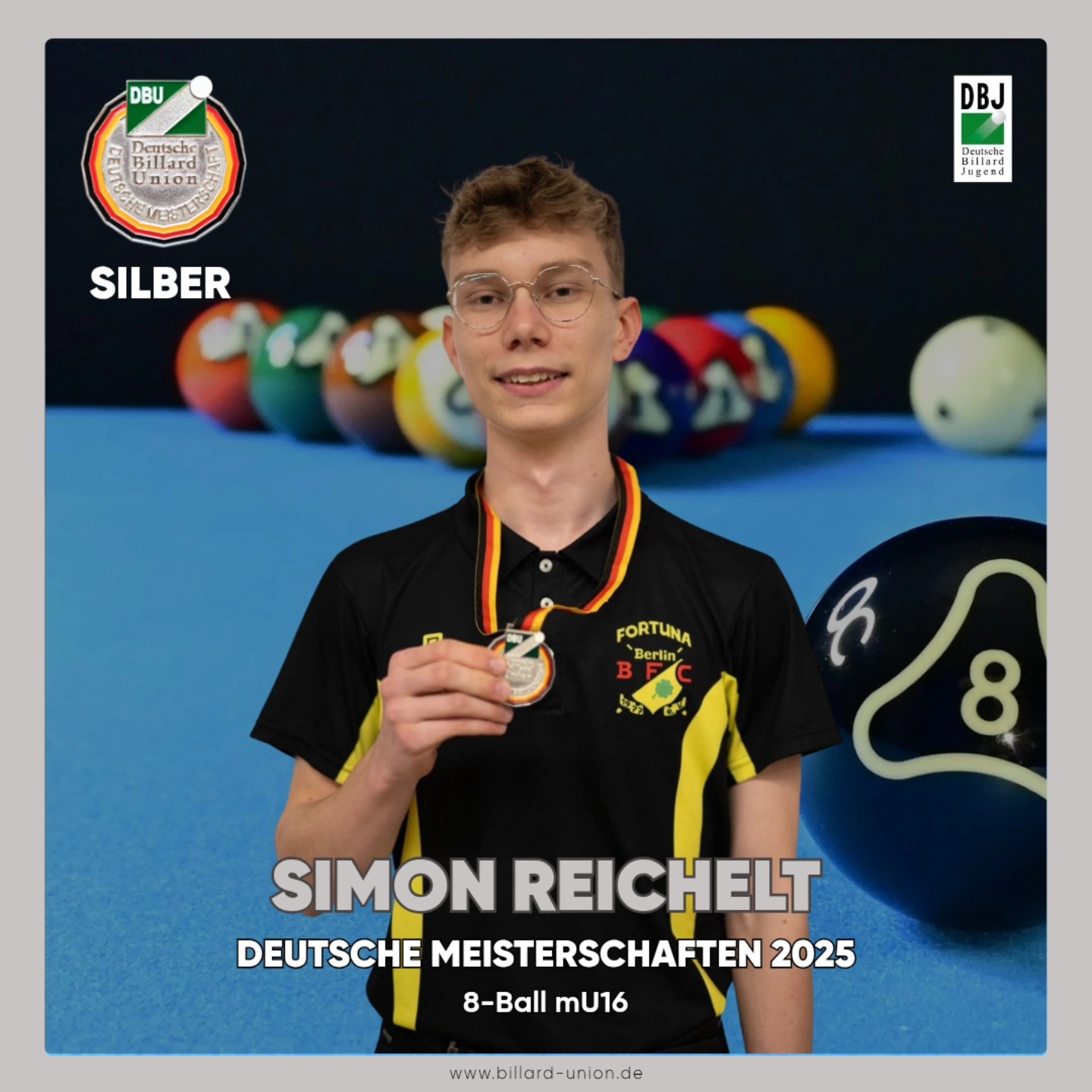 Simon holt Silber und Bronze auf der DJM 2025 Christian Balk / 13 hours ago 15.November 2025 Simon schlieรt die Deutschen Jugendmeisterschaften 2025 mit 2 Medaillen ab!! Silber im 8-Ball mU16 und Bronze im 14/1 e mU16. Deine Fortunesen gratulieren dir ganz herzlich! Bilder Quelle: www.billard-union.de und privat Share on FacebookFollow usSave